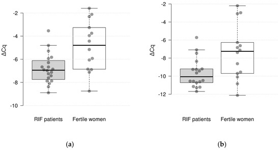 Differences in gene expression levels (ΔCq values) in endometrial tissue between RIF patients and fertile women: (a) CXCL1 gene; (b) C4BPA gene.