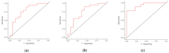 Most of the statistics were obtained with the Jamovi program v. 2.3.28 (https://www.jamovi.org, accessed on 5 September 2024). The statistical significance of the differences in ΔCq between the groups was calculated using the two-tailed Mann–Whitney U test. Spearman’s rank correlation method was used to examine the relationships between the quantitative variables, and p < 0.05 was considered statistically significant. For multiple comparisons, the online FDR correction calculator was used to adjust the p-values (https://www.sdmproject.com/utilities/?show=FDR, accessed on 5 September 2024). For the comparative visualization of the gene expression levels, box plots were constructed using a web tool, BoxPlotR (http://shiny.chemgrid.org/boxplotr, accessed on 5 September 2024). The characteristics of the markers were evaluated via ROC analysis using the web tool easy ROC v.1.3.1 [27] and Jamovi. The Youden’s index method was used to calculate the optimal cut-off points. The evaluation of the classifiers via the interpretation of the area under the ROC curve (AUC) was performed as described in [28].