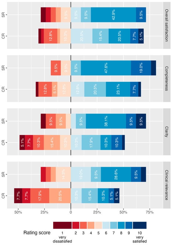 Results of department-wide survey on report quality of lower extremity CTA. Participants were asked to express their satisfaction with various aspects of the quality of structured reports (SR) and conventional reports (CR) for lower extremity CTA on a scale from 1 (very dissatisfied) to 10 (very satisfied). Responses of all survey participants are summarized in diverging stacked bar charts and percentages for each rating per report form and quality aspect are illustrated.