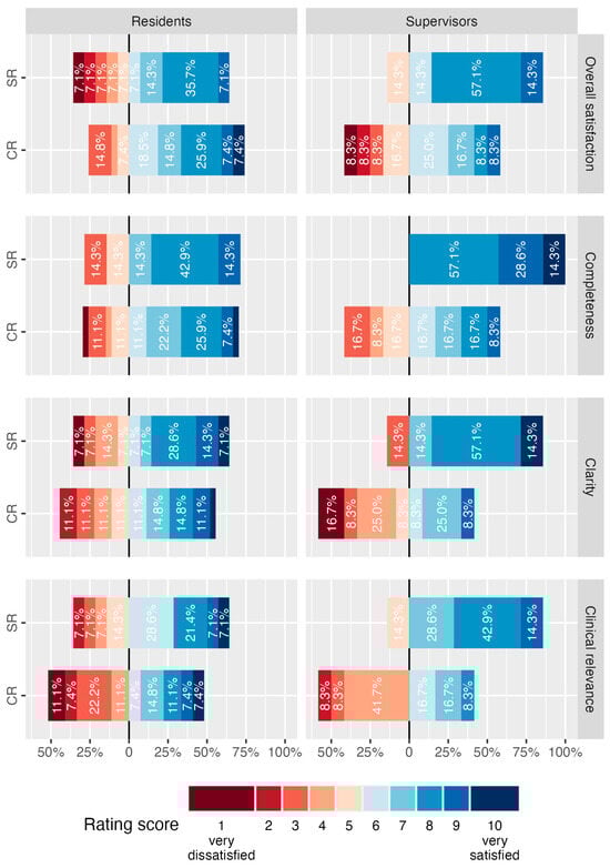 On a scale from 1 (very dissatisfied) to 10 (very satisfied), report completeness was rated significantly higher for SR with a median of 8.0 (IQR, 7.0–8.0) compared with a median of 7.0 (IQR, 5.0–8.0) for CR (p = 0.016). Supervising radiologists rated SR completeness with 8.0 (IQR, 8.0–9.0) compared to 6.0 (IQR, 4.8–7.2) for CR (p = 0.005). Median ratings of residents did not differ significantly with 8.0 (IQR, 5.5–8.0) for SR vs. 7.0 (IQR, 5.0–8.0) for CR (p > 0.05).