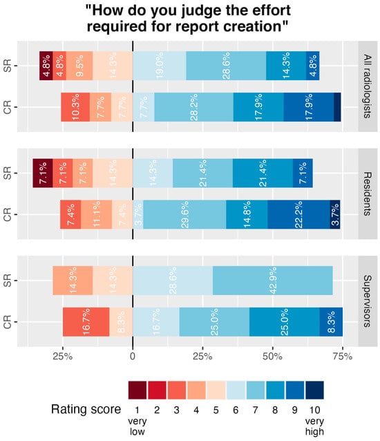 Survey results on the subjective effort required for the creation of reports as rated by participants of the department-wide survey are summarised in Figure 4. Subjective effort was rated on a scale from 1 (very low) to 10 (very high). No statistically significant difference was identified for the median responses of all participants (7.0, IQR, 5.5–8.0, for CR and 6.0, IQR, 5.0–7.0, for SR, p > 0.05). Residents’ median ratings were 7.0 (IQR, 5.5–8.5) for CR and 6.5 (IQR, 5.0–7.8, p > 0.05) for SR and supervising radiologists’ median responses were 7.0 (IQR, 5.8–8.0) for CR and 6.0 (IQR, 5.5–7.0, p > 0.05) for SR.