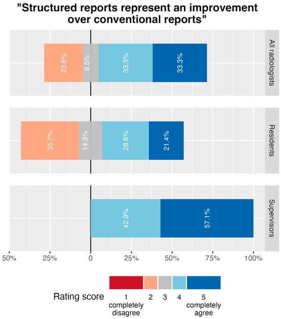 Results of department-wide survey on the statement “Structured reports represent an improvement over conventional reports”. Participants were asked to judge the statement “structured reports represent an improvement over conventional reports” on a scale from 1 (completely disagree) to 5 (completely agree). Responses of all survey participants ((top) row) as well as disaggregated by level of education in radiology, are summarized in diverging stacked bar charts and percentages for each rating are given.