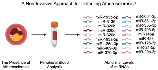 The condition of atherosclerosis is associated with altered expression of numerous miRNA molecules, which can be detected in peripheral blood. It offers a potential to implement miRNAs in the diagnostic process. Created with BioRender.com.