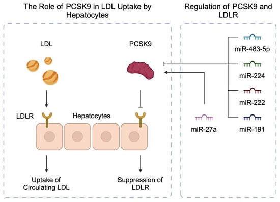 By contrast to the molecules described above, other miRNAs can enhance the expression of PCSK9, thus stimulating LDLR degradation and the progression of atherosclerosis. miR-27a was found to target molecules involved in LDLR endocytosis, including LDLR-related protein 6 (LRP6) and LDLR-adapter protein 1 (LDLRAP1). Moreover, the molecule increased the expression of PCSK9 [55]. Intriguingly, the use of PCSK9 immunogenic peptide in mice was associated with a significant decrease in miR-27a expression [56]. LDLR plays a very important role in the metabolism of LDL from plasma. It has been shown that genetic dysfunctions of LDLR are associated with increased cardiovascular risk through an increase in plasma LDL concentration [57]. Recently, a new LDLR regulator, the (pro)renin receptor [(P)RR], was identified. Interestingly, Wang et al. proved that miR-148a strongly affects (P)RR, reducing its expression, which also reduces the concentration of LDLR in Huh7 and HepG2 cells and ultimately leads to a reduction in cellular LDL uptake [58]. Additionally, there are studies that indicate that obese mice have higher concentrations of miR-148a in the adipose tissue and liver [59,60]. Furthermore, miR-152 is also associated with the regulation of (P)RR expression [61]. Another interesting finding is that LDLR abundance can be modulated by miR-33a-3p. Additionally, the expression of ANGPTL3, an LPL inhibitor, is directly inhibited by miR-33a-3p, contributing to the reduction in LDL in plasma [62,63]. Factors that regulate LDLR may also be miR-224 or miR-520d. Overexpression of these miRs leads to a decrease in LDLR protein and reduced LDL binding [51]. Other microRNAs involved in LDLR expression include miR-128-1, miR-185, and miR-27a/b [64]. Figure 2 summarizes the involvement of miRNAs in PCSK9 and LDL metabolism.