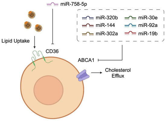 Another method that is associated with cholesterol transport and atherosclerosis is cholesterol efflux. This process is mediated by the ATP-binding cassette (ABC) transporters such as ABCA1. These transporters enhance the secretion of HDL, and the cholesterol efflux capacity has been associated with lower cardiovascular risk [79,80]. Modulating the expression of ABC transporters is another mechanism that could be targeted in the treatment of atherosclerosis. The expression of ABCA1 is also mediated by miRNAs. miR-320b was found to target ABCA1/G1 transported in macrophages. Accordingly, its overexpression suppressed cholesterol efflux. Intriguingly, the expression of miR-320b was upregulated in peripheral blood mononuclear cells (PBMCs) obtained from patients with CAD [81]. Additionally, 16-week treatment with anti-miR-144 of Ldlr−/− mice fed with a Western diet increased the protein expression of ABCA1. Simultaneously, the upregulation of ABCA1 was accompanied by a 20% increase in HDL cholesterol. This treatment was associated with reduced plaque formation, as compared to animals in different cohorts [82]. Other miRNAs regulating the expression of ABCA1 include miR-30e, miR-92a [83], miR-19b [84], miR-33a [85], and miR-302a [86], among others. Figure 3 schematically presents the involvement of miRNAs in lipid uptake and cholesterol efflux. Furthermore, Table 1 summarizes the role of miRNAs in regulating molecules associated with lipid involvement and transportation.