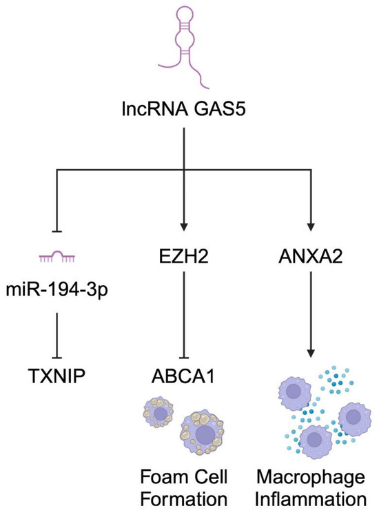 lncRNA growth arrest-specific 5 (GAS5) is another molecule that is suggested to be involved in the progression of atherosclerosis [107]. For instance, it stimulates lipid accumulation in macrophages, thus contributing to the formation of foam cells [108]. lncRNA GAS5 was found to be implicated in several mechanisms associated with atherosclerosis. Li et al. described how GAS5 can induce atherosclerosis through the GAS5/miR-194-3p/TXNIP pathway. The authors showed that the expression of GAS5 was elevated in rats with atherosclerosis. The molecule regulated the expression of TXNIP by acting as a sponge for miR-194-3p [109]. Interestingly, it has been proven that ANXA2, a calcium-regulated protein that binds phospholipids and belongs to the annexin X family, is a target for GAS5 in macrophages. ANXA2 deficiency in mice inhibited the development of atherosclerosis and endothelial cell proliferation. It regulates several mechanisms, including the transduction of inflammatory cell signaling, thus mediating the proliferation of macrophages into plaques. Moreover, ANXA2 increases the release of TNF-α, IL-1β, and IL-6 by binding to the TLR4 receptor located on macrophages [110,111,112]. In another study, Meng et al. described that GAS5 binds to the enhancer of zeste homolog 2 (EZH2), which is a histone methyltransferase. Mechanistically, GAS5 enhanced EZH2 activity, which negatively regulated ABCA1 expression. Consequently, the axis enhanced intracellular lipid accumulation [108]. Shen et al. pointed out that GAS5 can act as a sponge of miR-135a, which affects the molecule Janus kinase 2 and toll-like receptor 4 (TLR4). Consequently, a lower expression of miR-135a indicates a higher risk of plaque formation by disturbing lipid metabolism in macrophages [113]. Additionally, GAS5 has been shown to inhibit the expression of miR-21, which enhanced that of PDCD4 proteins. PDCD4 proteins promote the development of atherosclerosis by increasing the apoptosis of HUVEC. Increased PDCD4 expression was also found in macrophage-derived foam cells [114]. Therefore, due to the potential involvement in the pathogenesis of atherosclerosis, GAS5 could be a promising target in the diagnosis and therapy of this arterial condition (Figure 4).