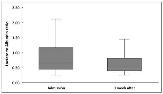 LARs were significantly decreased one week after sepsis onset in all patients (0.69 (0.23–3.06) vs. 0.49 (0.26–7.36), p < 0.001) (Figure 1). Lactate also decreased significantly (2.1 (1–9) mmol/L vs. 1.3 (0.7–19) mmol/L, p < 0.001). However, albumin did not change significantly (2.46 ± 0.59 g/dL vs. 2.41 ± 0.47 g/dL, p = 0.27).