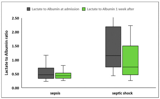 Lactate to albumin ratio upon inclusion in the study and one week later in patients with sepsis (n = 60) and septic shock (n = 42).