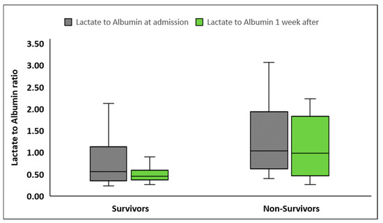 Lactate to albumin ratio upon inclusion in the study and one week later in survivors (n = 72) and nonsurvivors (n = 30).