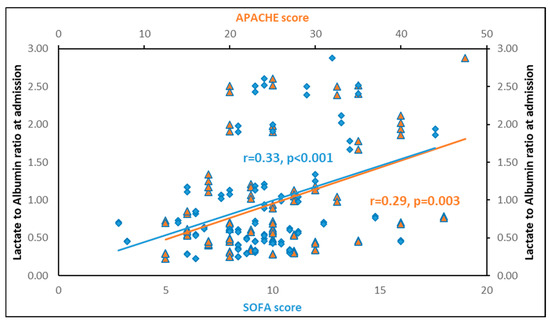 Lactate to albumin ratio upon inclusion in the study is significantly associated with APACHE II (r = 0.29, p = 0.003) and SOFA (r = 0.33, p < 0.001) scores. In blue: correlation of LAR with SOFA score. In orange: correlation of LAR with APACHE score.
