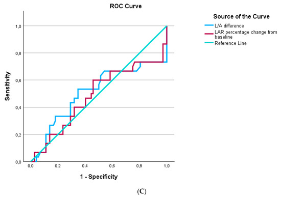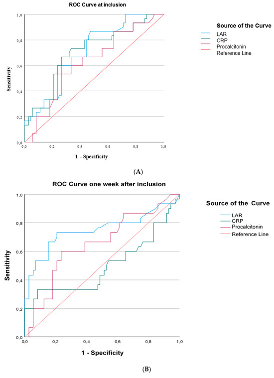 ROC curves were generated for LAR and inflammatory biomarkers that differed significantly between survivors and nonsurvivors at sepsis onset and one week later. At inclusion in the study, LARs performed similarly to CRPs and procalcitonin in discriminating survivors from nonsurvivors (Figure 5A). One week after inclusion in the study, LARs presented similar discriminating abilities with CRPs and procalcitonin (Figure 5B). LAR kinetics, expressed as the decrease in LARs and LAR percentage change from baseline, could not discriminate survivors from nonsurvivors (Figure 5C).