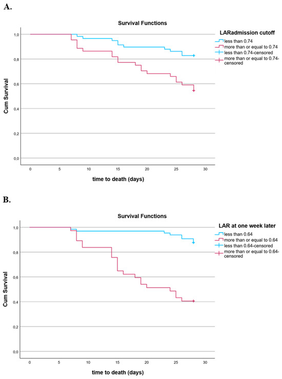 The Kaplan–Meier survival curves demonstrated that patients with a lower LAR at sepsis onset presented a better outcome at 28 days, with the cutoff value of the LAR being 0.74 (Figure 6A). Additionally, patients with a lower LAR one week after inclusion in the study had improved survival at 28 days, with the cutoff value of the LAR estimated at 0.64 (Figure 6B).