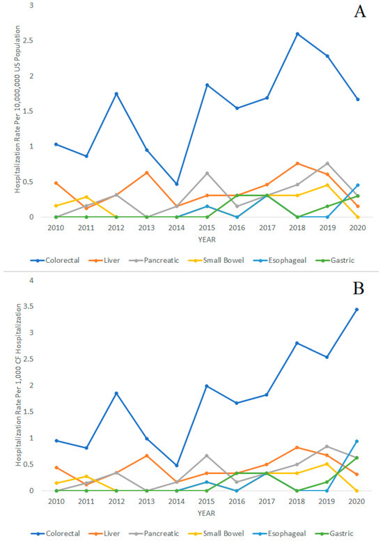 Hospitalization rates of colorectal, liver, pancreatic, small bowel, esophageal, and gastric cancer over time in patients with cystic fibrosis (CF), 2010–2020. (A) Hospitalization rates per 10,000,000 people in the general United States population. (B) Hospitalization rates per 1000 CF hospitalizations.