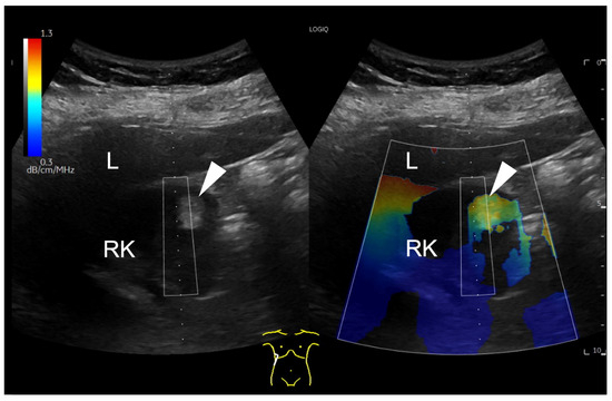 B-mode ultrasound image showing a focal hyperechoic lesion (arrowhead) in the cortex of the right kidney (RK). In the attenuation map on the right side, the lesion appears in red and yellow, representing a higher attenuation than the surrounding tissue. The level of attenuation is shown color-coded on the scale on the top left corner of the image. Next to the right kidney, the liver (L) is displayed. A region of interest (ROI) box is displayed above the hyperechogenic lesion.