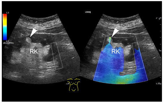 B-mode ultrasound of the right kidney (RK), displaying a focal hyperechogenic lesion (arrowhead) in the cortex, which is barely included in the colour coded attenuation map. The ROI box on the right side of the map can be only moved horizontally due to methodological reasons. Due to the superficial localization of the small renal lesion, the attenuation colour map is only partial applicable (arrowhead).