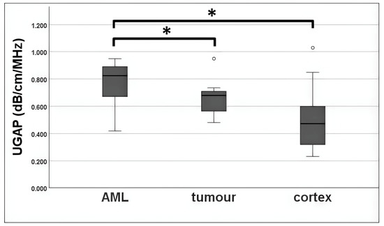 UGAP measurement was possible in 96.3% of all cases. The mean UGAP values of the AML subgroup (0.780 ± 0.157 dB/cm/MHz) were higher than those of the tumour subgroup (0.666 ± 0.135 dB/cm/MHz). A mean value was also calculated from the three measurements in the cortex next to the lesion. The mean measured attenuation in the cortex was 0.498 ± 0.194 dB/cm/MHz overall. There were statistically significant differences between AML vs. tumour (p = 0.034) and AML vs. cortex (p < 0.001). No significance was detectable between tumour and cortex (p = 0.093). A boxplot is given in Figure 3.