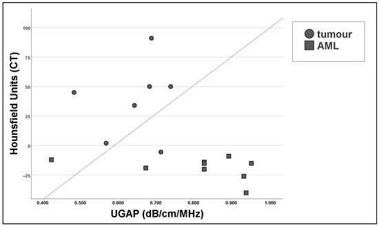The mean HU (Hounsfield units) measured in the ROI was −23.00 ± 15.69 in the AML group and 38.07 ± 32.53 in the other renal masses. The relationship between the Hounsfield measurements in CT and UGAP measurements was determined through Pearson’s correlation coefficient, which showed a strong negative correlation (r = −0.649) which was significant (p = 0.007). A scatter plot is shown in Figure 4.