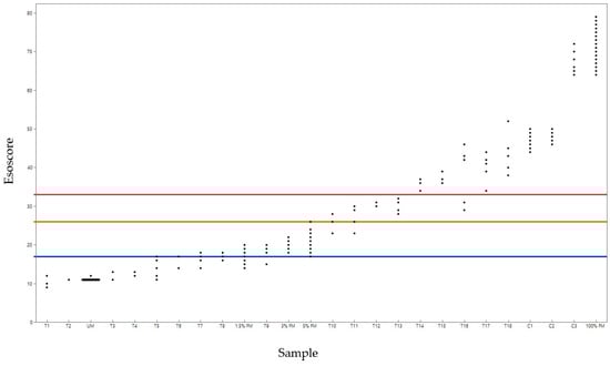 Esoscore results for all samples in the study. The horizontal orange line at 26 represents the boundary of lower-risk levels (low, low moderate) to higher-risk levels (high-moderate, high). T (tissue), C (cell line), UM (unmethylated DNA), 1.5%FM (1.5% fully methylated DNA), 3%FM (3% fully methylated DNA), 5%FM (5% fully methylated DNA), and 100%FM (100% fully methylated DNA). Blue line is the cutoff for low to low-moderate risk, orange is low-moderate to high-moderate risk level and red is high-moderate to high-risk level. Note: for the UM sample multiple samples are represented at Esoscore 10 indicated by the black line.