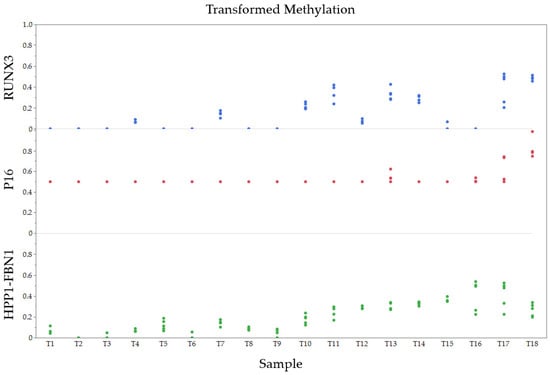 Methylation-specific PCR was performed on the Quantstudio 3 software version 1.5.2 (ThermoFisher, Carlsbad, CA, USA) using a set of 5 sets of primers and probes (IDT) for four methylation genes (HPP1, p16, RUNX3, and FBN1) as well as a control gene beta-actin (see Appendix B). All probes were labeled with a universal quencher and FAM. A five-point standard curve was made by dilution of a 100% methylated control from Zymo Research, Irvine, CA, USA (D5015). Fivefold dilutions were constructed in the range of 50 ng DNA to 0.08 ng DNA. Briefly, 20 µL reactions were set up consisting of 3–17 ng DNA, 0.5 µM forward and reverse primers, 0.25 µM probe, and TaqMan Fast Advanced Master Mix (no UNG) (ThermoFisher, Carlsbad, CA, USA, A44360). Cycling conditions were 95 °C 5 min, followed by 40 cycles of 95 °C 0:15, 60 °C 0:25, and 72 °C 0:30. Each sample was run in triplicate, and quantities were averaged. Samples where amplification was detected but below the assay limit of quantification or lower than the lowest standard of 0.08 ng DNA were imputed to LLOQ/2 (0.04 ng). Each gene was analyzed, and normalized methylation values (NMV) were obtained for all methylation genes by dividing by control gene beta-actin: