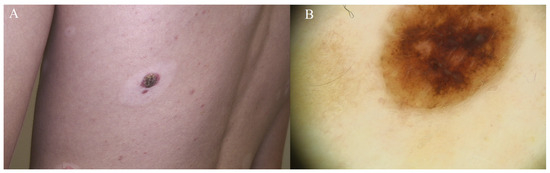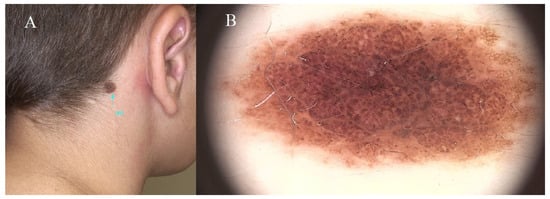 Benign nevi appear mainly during adolescence. They are characterized by a regular, symmetrical structure, a well-defined border, and evenly distributed pigment. The risk of developing melanoma from such acquired benign nevi is very low [1,10]. This lesion requires periodic dermatological observation (follow-up every 12 months) and sun protection. In case of any doubt, a diagnostic excisional biopsy is recommended.