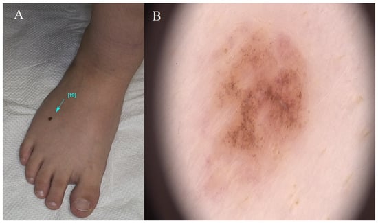 Dysplastic nevus. (A) Flat brown lesion located on the dorsal surface of the foot. (B) Pigmented lesion featuring a nodular pattern and homogenous brown pigmentation. Nodules of variable dimensions and shades are dispersed haphazardly. Peripheral amorphous pinkish zones denote increased vascularity. The blue line indicates the lesion being examined, magnification 20×.