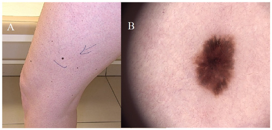 It is important to remember that the presence of dysplastic nevi does not guarantee the development of melanoma, and most dysplastic nevi remain benign. However, given their increased risk of melanoma and the potential for change, individuals with dysplastic nevi should be vigilant about skin self-examinations and follow-up with a dermatologist as recommended. Therefore, constant frequent dermatological observations (control every 6 months) and sun protection are required. In case of any doubt, a diagnostic excisional biopsy is indicated [12] (Figure 4).