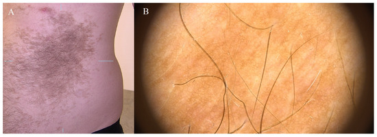 Becker’s nevus. (A) Extensive pigmented lesion on the abdominal integument, adorned with dark, coarser hairs than the surrounding epidermis. (B) Extensive nevus featuring a reticular line pattern and an abundance of hairs with hypopigmented follicular openings. Blue lines indicate the lesion being examined.