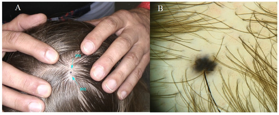 Blue nevus. (A) Small blue lesion, approximately 3 mm in diameter, localized within a pilosebaceous region of the skin. (B) Nevus displaying homogeneity in both color and structure, characterized by a blue hue. Terminal hairs are observed at the lower pole of the lesion, accompanied by hypopigmentation at the follicular orifices. Blue lines indicate the lesion being examined.