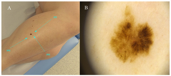 Superficial spreading melanoma. (A) Flat brown lesion on the skin of the right shin, measuring approximately 5 mm in diameter. (B) Nevus featuring an asymmetric reticular line pattern in both structural and chromatic aspects, with the presence of brown lines arranged segmentally and the observation of atypical reticular lines. Blue lines indicate the lesion being examined.
