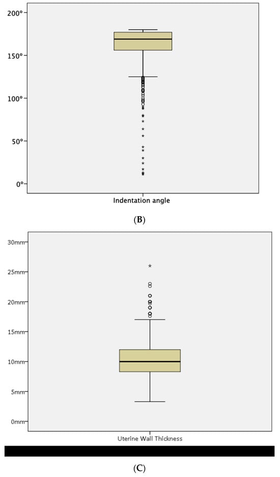 The overall data regarding the measurements of indentation depth, indentation angle, uterine wall thickness, and I:W ratio are shown in Table 2 and Figure 5. One hundred and ninety-three women (19.7%) had an indentation of 0 mm.