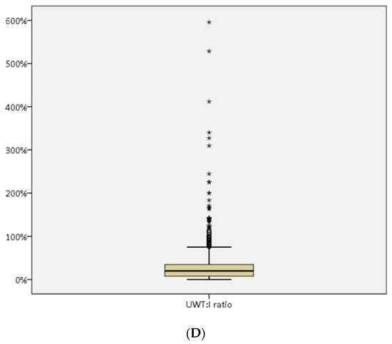 (A) Box plot showing median fundal indentation length, interquartile range, and outliers. (B) Box plot showing median indentation angle, interquartile range, and outliers. (C) Box plot showing median uterine wall thickness, interquartile range, and outliers. (D) Box plot showing median uterine wall thickness–indentation ratio (UWT:I), interquartile range, and outliers.