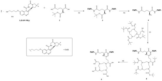 Organic synthesis of DOTA.GA.Glu.(FAPi)2 6: (a) HOBt, EDC*HCl, DIPEA, DMF, RT, overnight, 69%; (b) 4 M HCl in 1,4-dioxane, 1,4-dioxane, 0 °C-RT, 3 h, 95%; (c) HATU, DIPEA, DMF, and RT, overnight, 98%; (d) TFA:MeCN:TIPS:H2O (85:10:5:2.5), RT, 5 h, 28%.