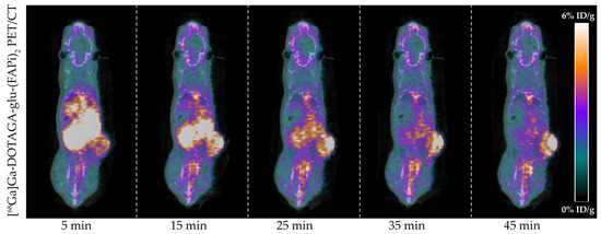 Tumor-bearing mice (n = 4) were successfully imaged with [68Ga]Ga-DOTAGA-Glu-(FAPi)2 PET/CT. A representative dynamic PET/CT image series of the in vivo cancer model is presented in Figure 3 showing the radioactive uptake at 5, 15, 25, 35, and 45 min post-injection.