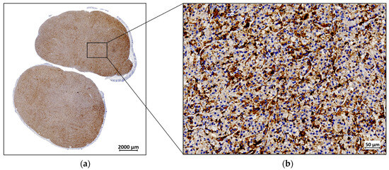 A representative example of fibroblast activation protein (FAP) expression by immunohistochemistry (IHC) in a U87MG resected tumor: (a) IHC staining for FAP at 1× magnification; (b) IHC staining for FAP at 40× magnification.