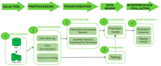 Knowledge Discovery in Databases (KDD), commonly used in data mining and artificial intelligence, is a methodology that identifies useful patterns and insights from large datasets, as illustrated in Figure 1. Moreover, it consists of five stages, which were used for the implementation of the models illustrated in Figure 2. In the first stage, the data are selected; in this case, the images are referred to as ASPIs. In the second stage, these pre-selected images are manipulated to handle missing values, classify the data by class, clean the data, etc. In the third stage, the data are transformed using a data augmentation approach, seeking to generate varied images from existing images in our dataset. In the fourth stage, the transformed data are used to train models with the predetermined architectures. For this phase, the pretrained prediction models ResNet101, ResNext101, Se-ResNext50, ResNext50, and MobileNet V2 were used and compared. Finally, in the last stage, called “Interpretation/Evaluation”, metrics are used to evaluate the results obtained from each model, which are then analyzed and interpreted for subsequent decision-making.