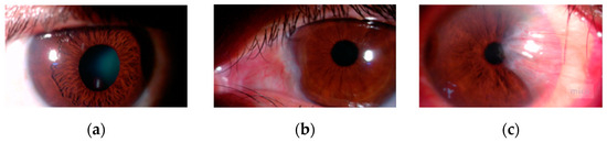 The dataset used was provided by the Peruvian Pterygium Center [7] and the authors of the articles [8,9,10,11]. A total of 540 anterior segment images of the eye (ASPIs) were obtained, of which 480 were captured using a medical tool called slit lamp and the rest using mobile devices. The data were classified into 3 classes, as shown in Figure 3: 101 ASPIs were classified as without pterygium, 167 as moderate pterygium, and 266 as severe pterygium. It should be noted that this data classification process was carried out by an ophthalmic surgeon from the Peruvian Pterygium Center.