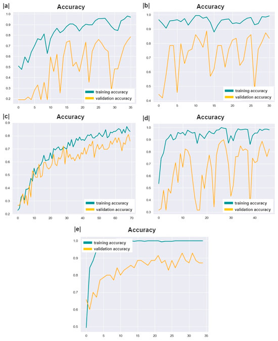 The results showed that ResNet101, ResNext50, ResNext50, Se-ResNext50, and MobileNet V2 achieved accuracy of 84%, 88%, 76%, 92%, and 82%, respectively. Figure 8 illustrates the training performance based on the accuracy across all preset epochs. The accuracy trends, shown in Figure 8a–e, indicate the proportion of correct predictions. The constant increase and the absence of sudden drops to avoid overfitting or misfitting demonstrate the superiority of Se-ResNext50 over the other models.