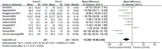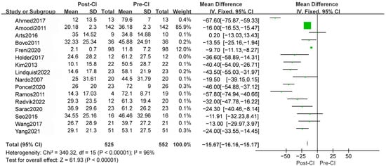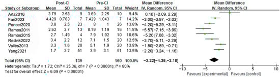 In eight studies involving 139 participants, it was found that CI resulted in a mean VAS difference of −3.12 [95%CI, −3.57 to −22.68, p < 0.0001] (Figure 5). The analysis showed a significant decrease in VAS in different follow-up times, with an MD of −2.51 [95%CI, −3.40 to −1.63, p < 0.0001], −3.47 [95%CI, −4.17 to−2.78, p < 0.0001], and −2.97 [95%CI, −3.78, −2.17, p < 0.0001], respectively, in short-term (3, 6 months), middle-term (12, 13 months) and long-term follow-up (18, 24 months), with no significant difference between subgroups (p = 0.24) (Figure S3A). The results remained significant in region subgroups, with an MD of −3.63 [95%CI, −4.24 to −3.01, p < 0.05] in Europe and −2.63 [95%CI, −3.34 to −1.92, p < 0.05] in Caucasians, revealing a subgroup difference (p = 0.0004) (Figure S3B). Furthermore, a meta-analysis of four studies including only SSD patients showed a significant effect, with an MD of −3.42 [95%CI, −4.05 to −2.79, p < 0.05] (Figure S3C). In summary, CI has a notable impact on decreasing VAS scores.