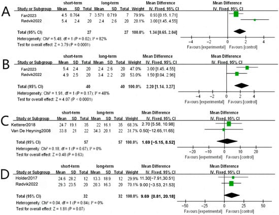 According to 5 studies analyzing different follow-up periods, a significant difference was found in tinnitus loudness in VAS between short-term follow-up and long-term follow-up, with an MD of −3.47 1.34 [95%CI: 0.65 to 2.04, p = 0.02]. In contrast, other indications, including THI, TQ, and tinnitus annoyance, showed no difference between short- and long-term follow-up (Figure 6).