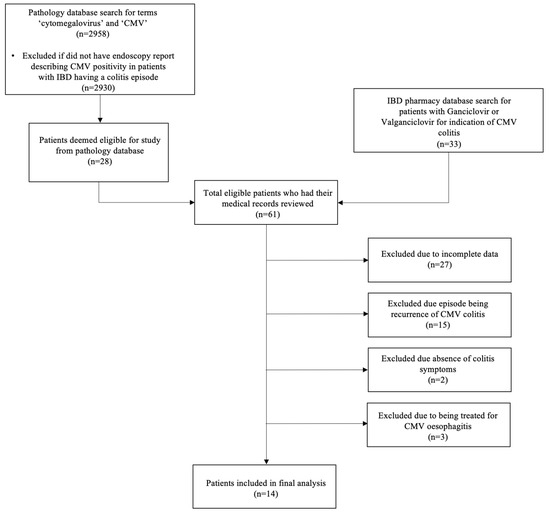 The pathology database search generated 2958 histopathology reports. Of these, 28 reports included some description of CMV positivity in patients with IBD having a colitis episode. The pharmacology database search generated 33 patients. Combining these, a total of 61 patients were identified as eligible for this study. Of the 28 patients identified from the pathology database, 26 were excluded due to incomplete data. Of the 33 patients identified from the pharmacy database, 15 were excluded due to the episode being a recurrence of CMV colitis, 2 due to absence of colitis symptoms, 3 due to being treated for CMV oesophagitis, and 1 due to incomplete data. The remaining 14 patients were included in the final analysis (Figure 1).