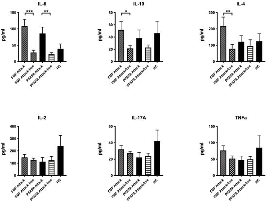 Plasma levels of different cytokines during attack and attack-free periods. FMF (familial mediterranean fever); PFAPA (periodic fever, aphthous stomatitis, pharyngitis, and adenitis); HC, (healthy control). (* p < 0.05; ** p < 0.01; *** p < 0.001).