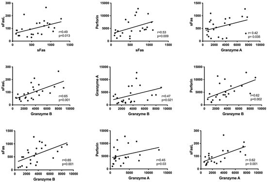 The levels of sFasL, granzyme A, granzyme B, and perforin are closely correlated with each other during the attack period of FMF patients (Figure 3).