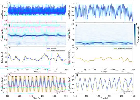 The procedure for obtaining the cardiac (Figure 1A–D) and respiratory (Figure 1E–H) trace is shown in Figure 1. Figure 1A,E show the average signal obtained using the masks of the left ventricle and the right lung, respectively. The analysis of each signal provides a spectrogram shown in Figure 1B,F. The observed maximum magnitude of the spectrum corresponded to the estimate of the frequency traces. The cardiac and respiratory traces are visualized in Figure 1C,G. The cardiac trace is visualized along with the reference measurements. The figure indicates an agreement between the device-less data-driven cardiac estimate and the measured pulse reference. The respiratory trace fluctuates within the expected range. Figure 1D,H show the filtered signal from the inverse STFT in the range of 100 s and 150 s of the acquisition.