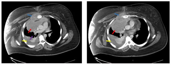 Computer tomography at diagnosis showing mediastinal adenopathy block (red arrows), with compression of vasculature (purple arrow) and invasion of thoracic wall and right pectoral muscle (blue arrows), pleural effusion (yellow arrows). Left side—ce reprezinta (descriere), Right side—ce reprezinta (descriere).