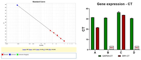 The standard curve was performed by designating the 50 ng gDNA as concentration 1, then the serial dilutions were 0.5, 0.25, 0.125, and 0.0625. By using the calculated slope of −2.9728, the Applied Biosystems software on a Step OnePlus RT PCR Machine calculated the SRY quantity from the patient sample T1 at 8 × 10−5 (0.00008). With a reference value of 50 ng DNA corresponding to concentration 1, the patient sample T1 is calculated as having 0.004 ng SRY product, as shown in Figure 3—left. The CT values highlight the presence of SRY and GAPDH in the DNA, as shown in Figure 3—right.