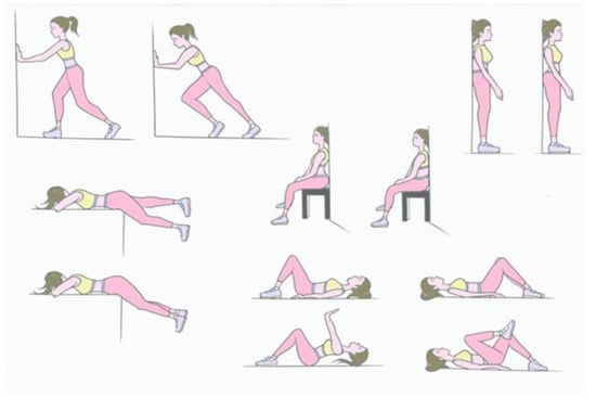 Standing postural correction: The patient was asked to lean with their shoulders against a wall with their feet about 30 cm from the wall and to level the lumbar lordosis (i.e., to eliminate the space between the wall and the back) by contracting the abdominal and gluteal muscles, and to hold this position for 10 s and then return to the starting position. The exercise was repeated 10 times (Figure 2.)