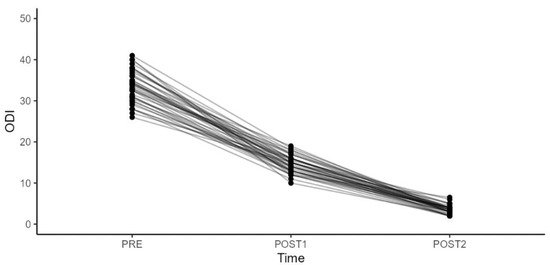 However, we found no statistically significant differences in the ODI changes related to sex, BMI, age, and work, either between T1 and T0, between T2 and T0, or between T1 and T2.