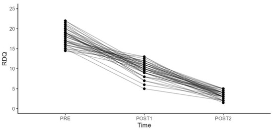 In terms of the RDQ, there was a statistically significant improvement (p-value < 0.001) in the scale values when comparing the period between the second rehabilitation cycle and infiltration (T2) and the first rehabilitation cycle and infiltration (T1), as well as at baseline (T0) and between T2 and T0. The most significant improvement was observed between T2 and T0, with a mean difference value of −14.6. On the other hand, there were no statistically significant differences in the ODI changes related to sex, BMI, age, and work, either between T1 and T0 or between T2 and T0.