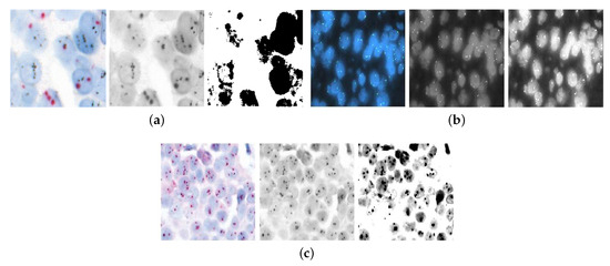 Differenttypes of cytogenic images resulting from ISH: (a) FISH at 20× magnification, (b) CISH at 20× magnification, and (c) SISH at 40× magnification.