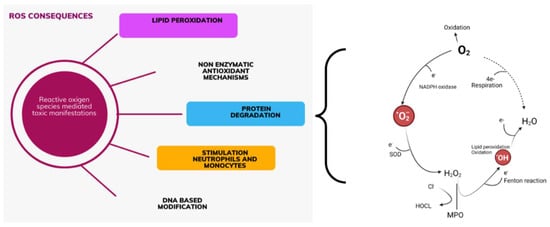 Oxidative stress occurs due to a disturbed balance between oxidant activity, i.e., the creation of free radicals, and the function of the antioxidant system in the body. Damage to the structure of the cell and disruption of its function occurs during a large accumulation of oxidants and antioxidants. This imbalance plays a major role in the oxidative damage of the cell, on the molecules of proteins, lipids, carbohydrates, enzymes, and nucleic acids, in the role of oxidases, reactive oxygen species (ROS) formed in these reactions, which can be used as biomarkers of oxidative stress. ROS in small concentrations is essential for maintaining homeostasis at a given moment. A slight increase in ROS and reactive nitrogen species (RNS) levels, responsible for normal redox signaling, promotes cell proliferation and differentiation [,]. Oxidative stress can directly affect deoxyribonucleic acid (DNA) and initiate mutagenic lesions, and indirectly, by initiating autocatalytic lipid peroxidation, it can influence the formation of DNA adducts. During lipid peroxidation, which is the most significant negative consequence of synthesizing ROS, genotoxic decomposition products are created, of which the indicator of the level of lipid peroxidation is Thiobarbituric Acid Reactive Substance (TBARS), thiobarbituric acid and its end product [,]. It has been shown that oxidized proteins, especially products of oxidative modification of protein Advanced Oxidation Protein Product (AOPP), are created during the activation of oxidative activity at the level of neutrophils and monocytes. Stimulation of these cells causes the so-called monocyte respiratory burst and the secretion of various inflammatory mediators. Their measurement is also a marker of monocyte activation (Figure 1) [,].